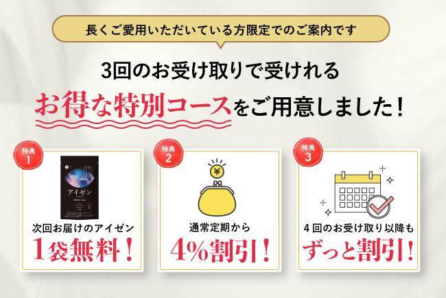 ・初回3袋(8,560円(税込)、送料無料)でお届けし、その後90日ごとに3袋ずつお届けする定期便です。 ・2回目以降は、3袋で12,840円(税込)、送料無料でのお届けとなります。 ・2回ご継続時のお支払い合計金額は21,400円(税込)です。 ・本コースは3回のお受け取りのお約束をお願いしております。 ・以前と同じ支払方法で承らせていただきます。コンビニ払いの場合は、支払手数料150円(税込)を頂戴いたします。