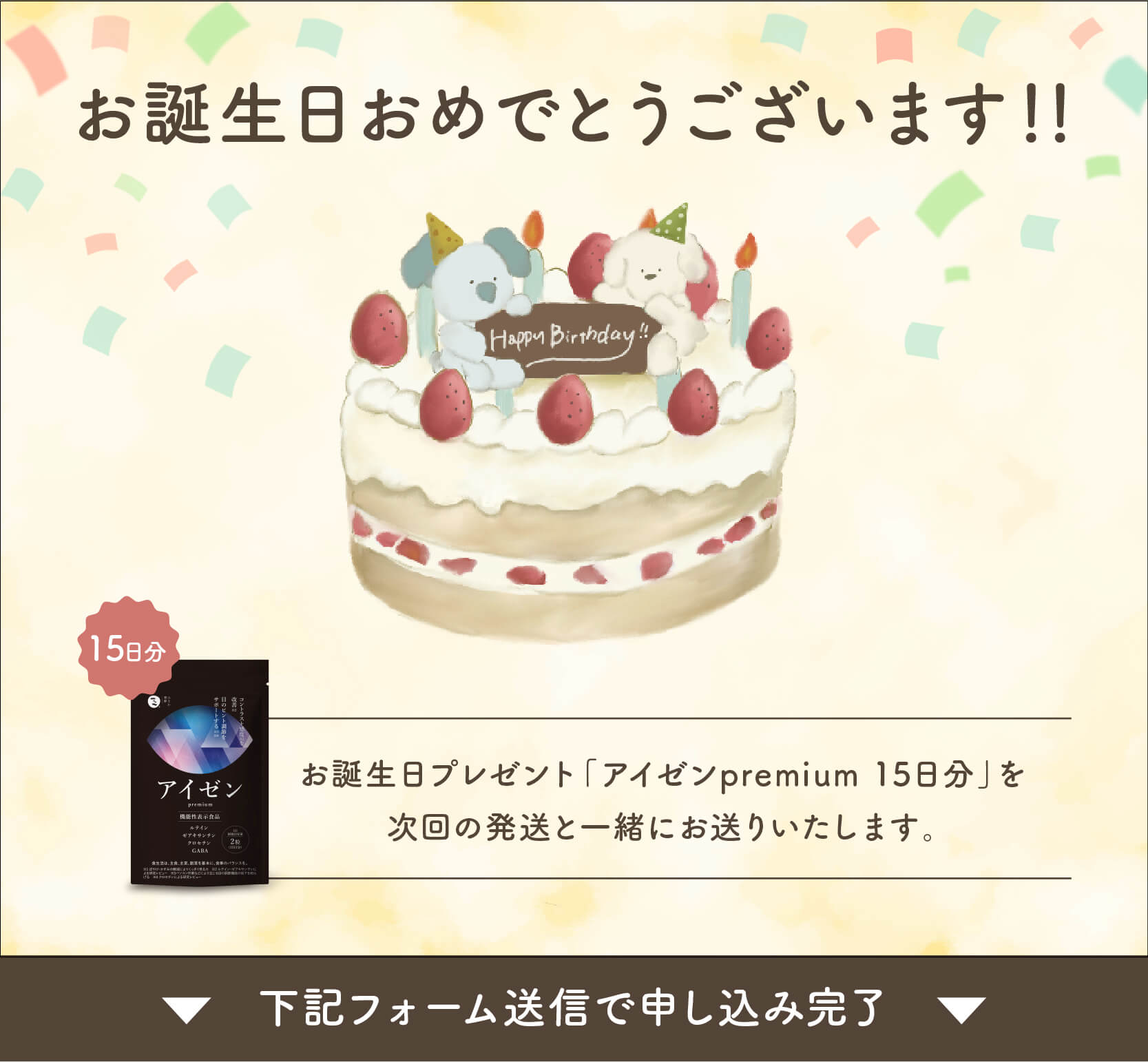 ・お誕生日のお祝いとして「アイゼンpremium15日分」を1袋プレゼントいたします。 ・ご利用中の定期便の最短発送分に同梱してプレゼントをお届けいたします。 ・次回お受け取り前に定期便を解約される場合は、プレゼント発送ができません。