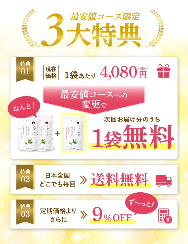 〈キャンペーン詳細〉 ・初回3袋(7,360円(税込)、送料無料)でお届けし、その後90日ごとに3袋ずつお届けする定期便です。 ・2回目以降は、3袋で11,040円(税込)、送料無料でのお届けとなります。 ・2回ご継続時のお支払い合計金額は18,400円(税込)です。 ・本コースは4回のお受け取りのお約束をお願いしております。 ・以前と同じ支払方法で承らせていただきます。コンビニ払いの場合は、支払手数料150円(税込)を頂戴いたします。 -------------------------------------------------------