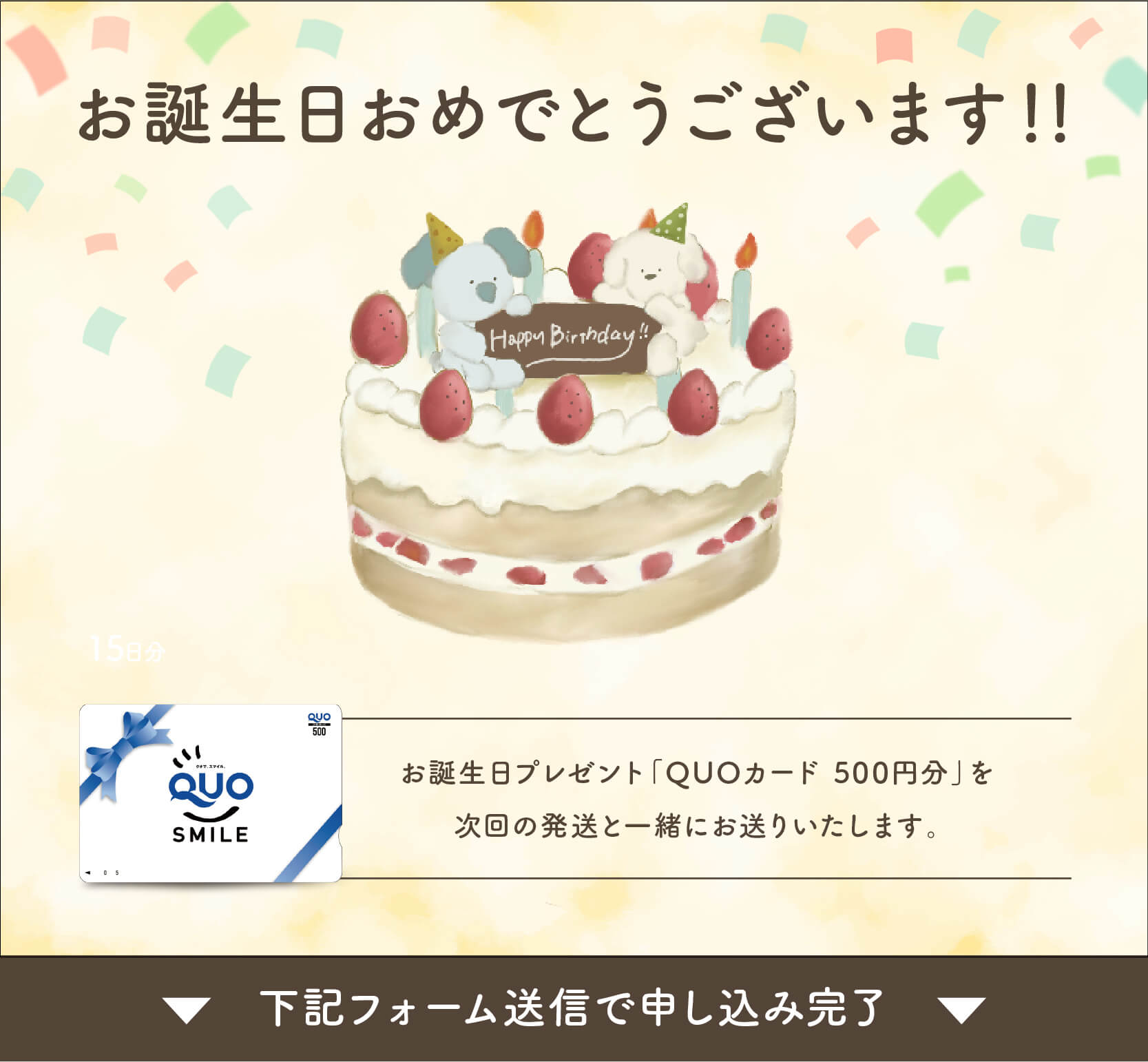 ・お誕生日のお祝いとして「QUOカード500円分」をプレゼントいたします。 ・ご利用中の定期便の最短発送分に同梱してプレゼントをお届けいたします。 ・次回お受け取り前に定期便を解約される場合は、プレゼント発送ができません。