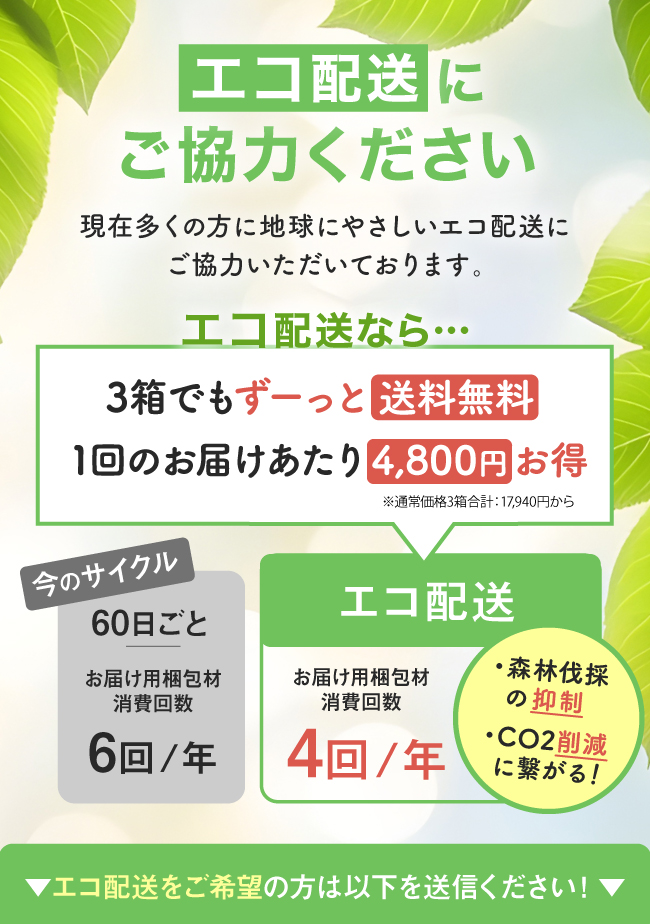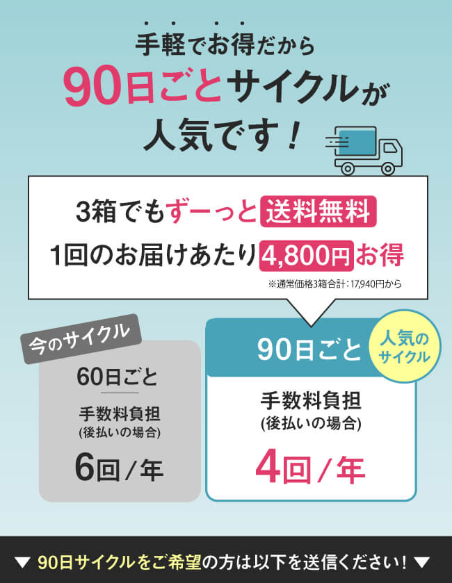 〈お届け頻度について〉 ・お届け頻度を【90日ごと】でお届けいたします。 ・初回30日分を1箱・2回目以降90日ごと3箱です。当コースは、お客様からご解約の申し出がない限り継続する期限の定めのない契約です。 ・2回目以降は3箱合計13,140円(税込)でお届けします。 ・後払い手数料は150円がかかります。 ・3回(約半年分)継続した場合の総額27,260円(税込) (商品代金合計:27,260円(税込) 、送料無料)になります。